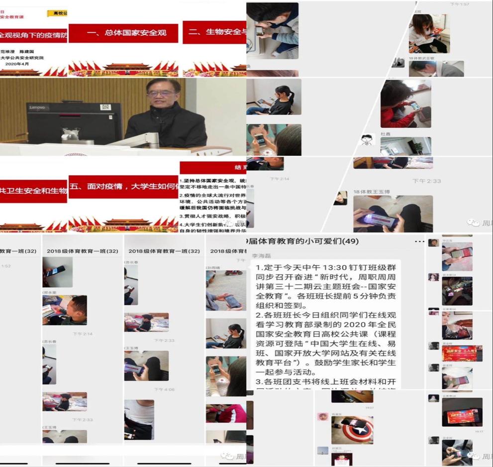 4月14日下午13:30,在体育学院钉钉班级群里,李海磊老师紧紧围绕“国家安全,人人有责”,结合当前疫情发展形势和大家关切的问题,分别从树立国家安全意识、不触碰法律红线、生活中我们可以这样做和保守国家秘密法四个方面展开探讨,他教导大家一定要学会感恩、懂得感激,做个诚实守信、有责任有担当的新时代大学生。